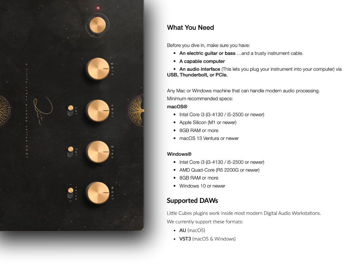 The DSP for LC_ROOT was designed and written by David Maxim Micic. While inspired by specific classic tones, it wasn’t built to copy any amplifier down to the last component.